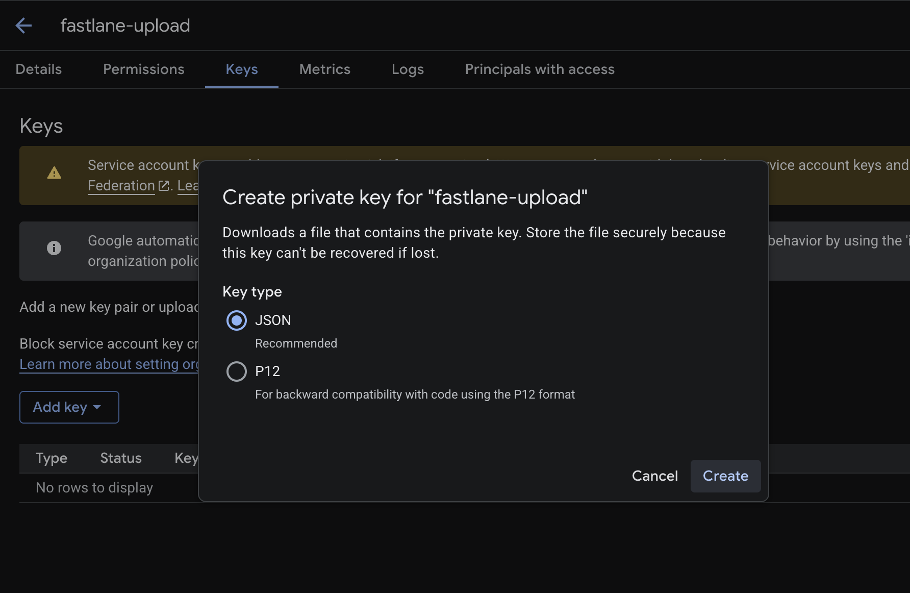 STOP: A file will download to your computer. This is the literal key to your app's distribution. Do not lose it. Do not commit it to Git. By the way, Google advise against using service accounts keys and recommend using Workload Identity Federation instead, but that goes beyond the scope of this article. We will stick to the key we just downloaded and will add it later in our CI secrets.